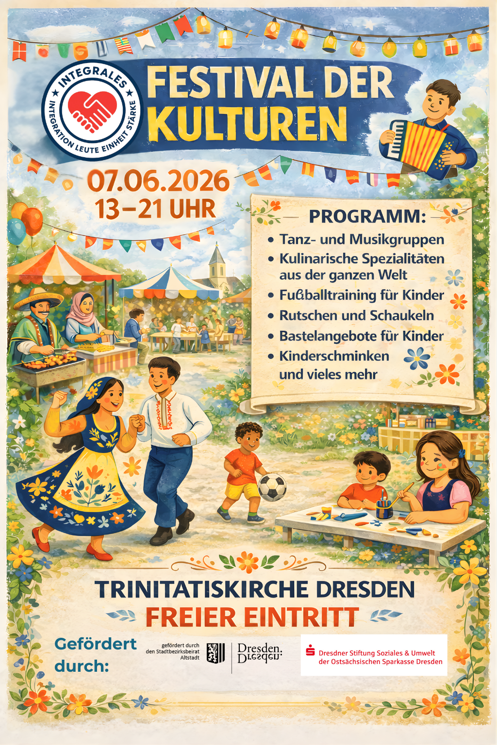 Das Festival der Kulturen ist ein internationales Kulturfest, das am 07. Juni 2026 von 13:00 bis 21:00 Uhr in und rund um die Trinitatiskirche in Dresden stattfindet. Ziel ist die Förderung des interkulturellen Dialogs und die Stärkung des gegenseitigen Verständnisses zwischen den Communities in Dresden.